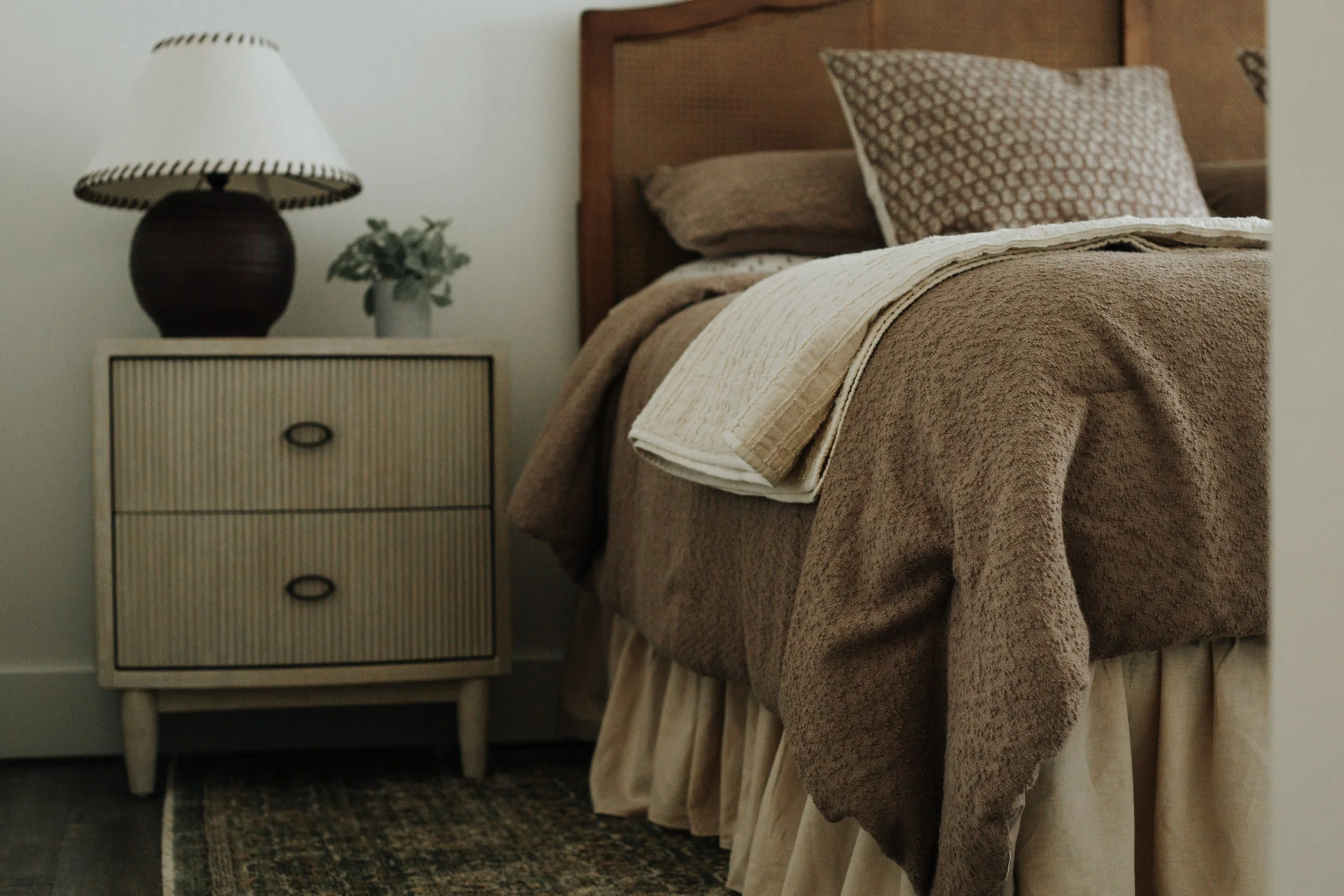 These clients located in the Twin Cities, MN area, wanted some bedrooms refreshed. We focused on creating a feminine, cohesive space with many layers of textures with some vintage aesthetic. Updated furnishings, lighting, and textiles brought warmth and balance to the room, while intentional layout decisions improved functionality. The finished bedroom feels layered, comfortable, and thoughtfully designed.