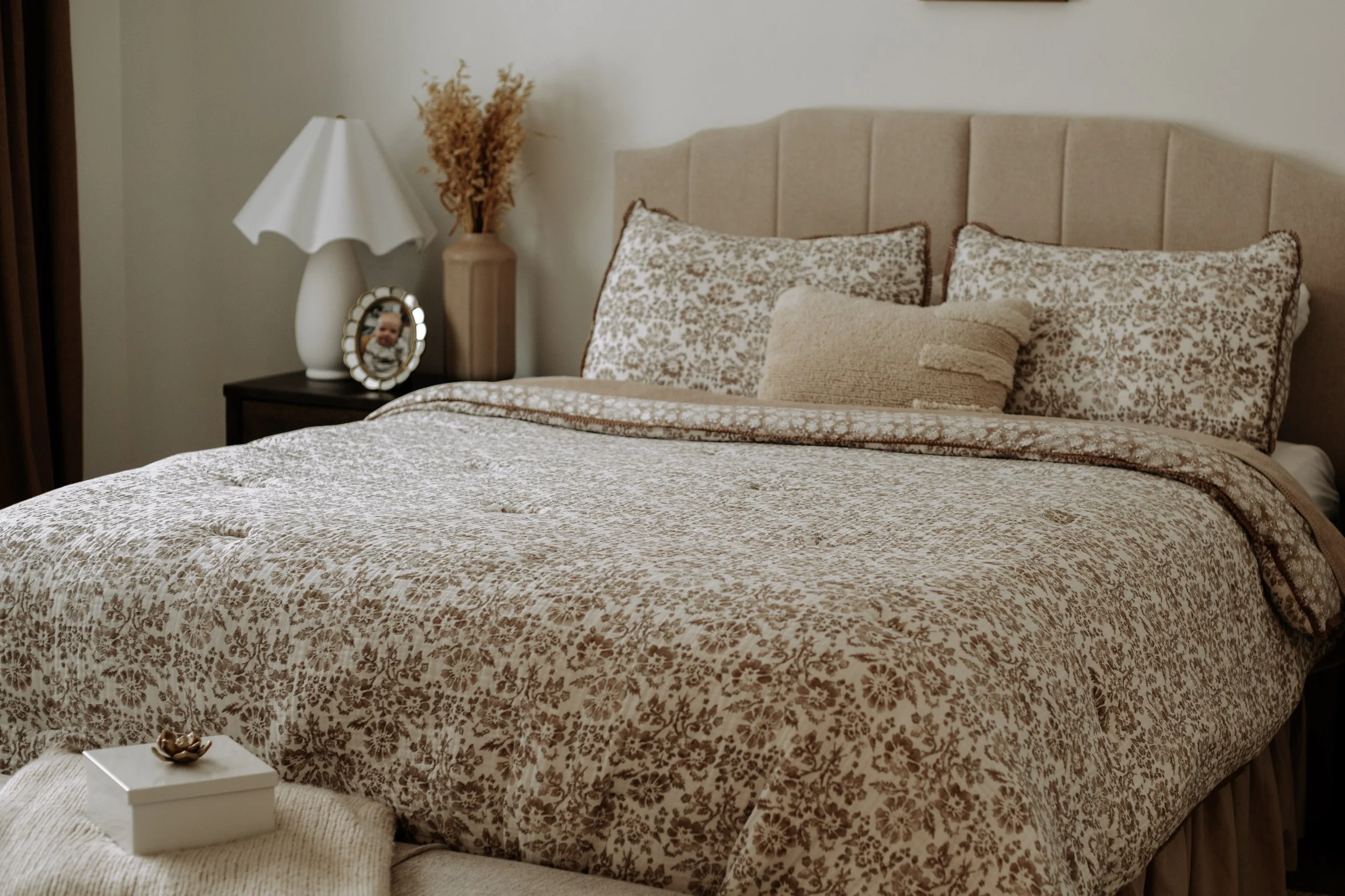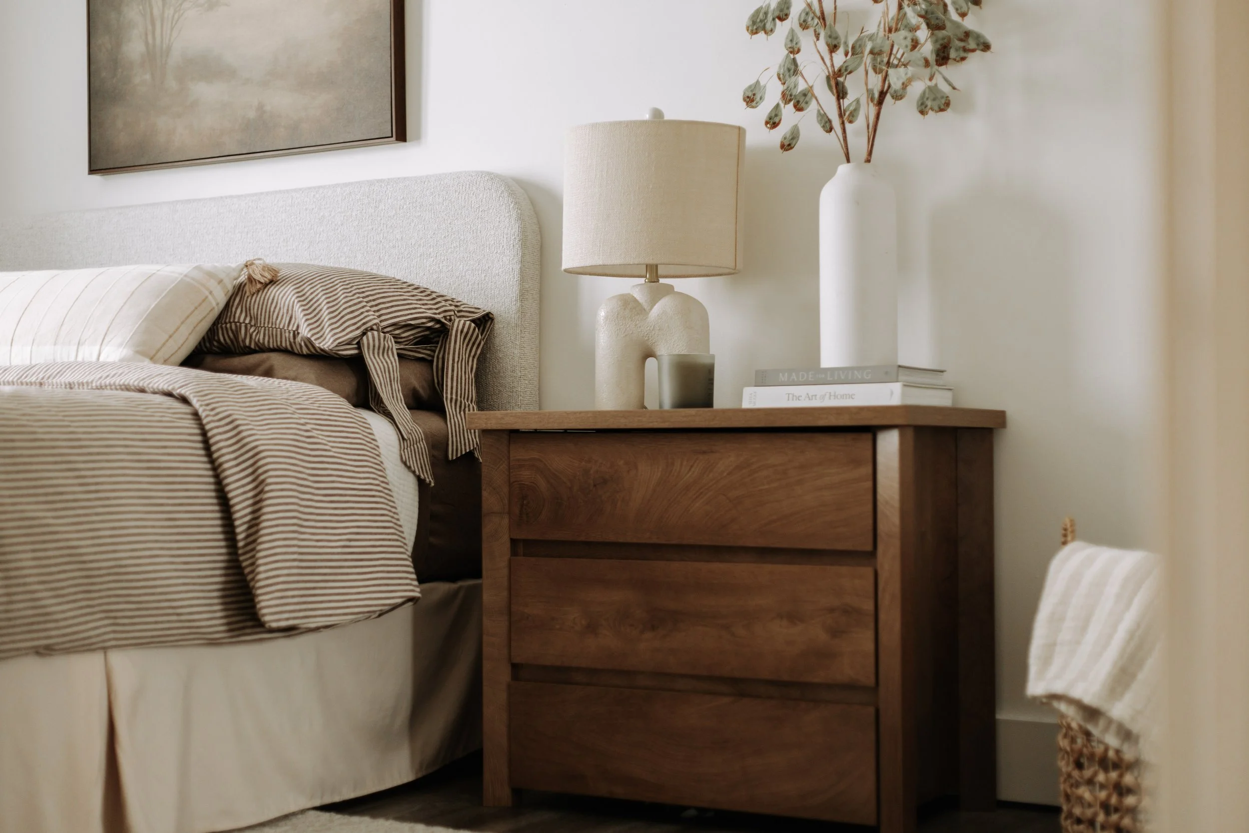 This bedroom refresh centers on pattern, natural elements, and a soothing color palette. Tailored details, warm wood tones, and layered linens come together to create a calm, relaxing space designed for everyday living.