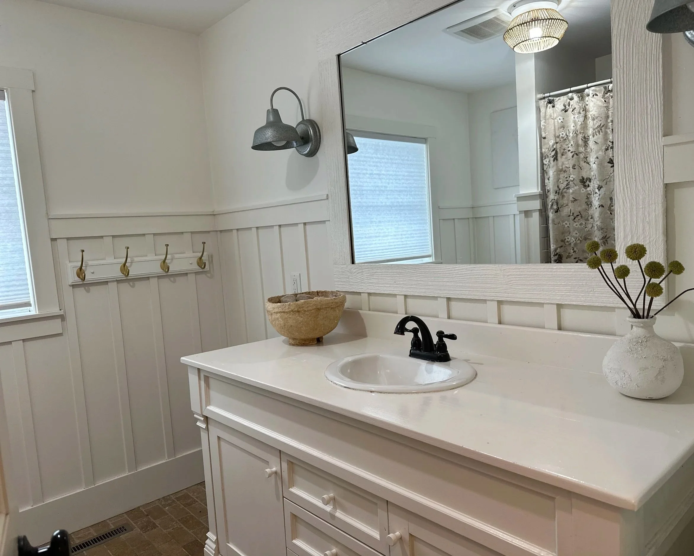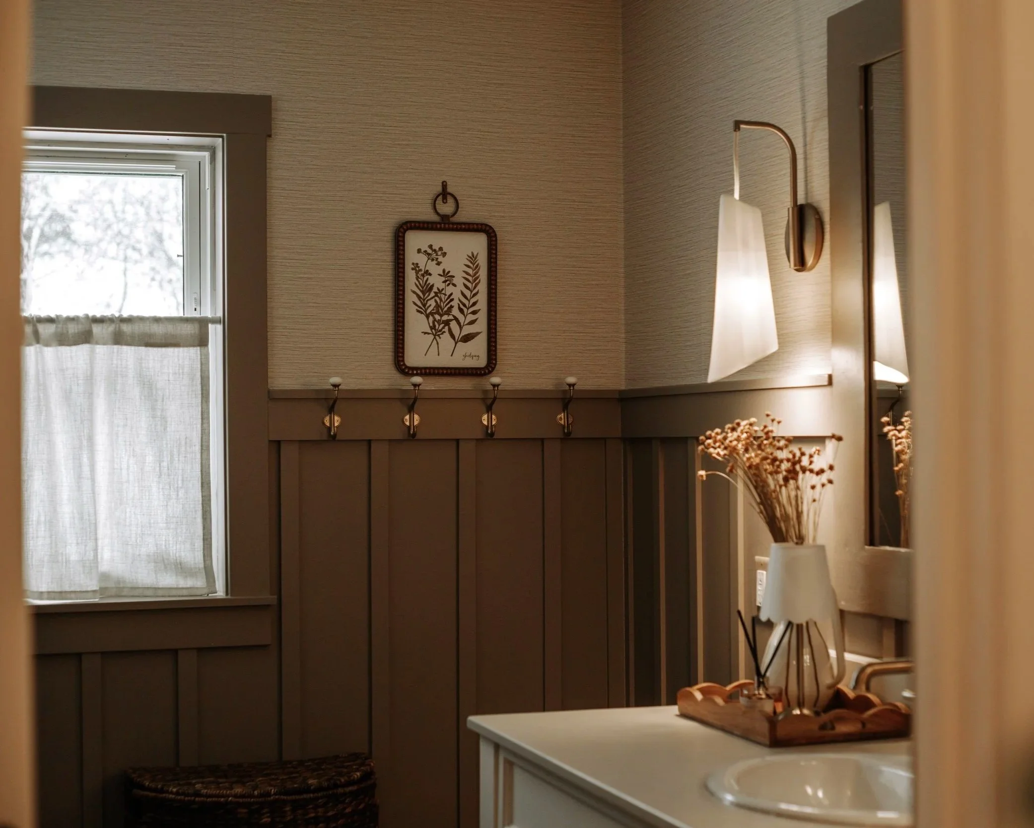 This bathroom refresh transformed a once-white space into a vintage-inspired, moody design while thoughtfully reusing many of the existing elements. By keeping the original vanity, tile, and flooring, we focused on impactful updates—painting the vanity, adding texture with grasscloth wallpaper, and introducing new hardware and sculptural wavy sconces. Final layers of a linen café curtain, vintage art, a woven hamper, and curated details elevated the space, resulting in a richly layered bathroom that feels warm, character-driven, and beautifully finished.